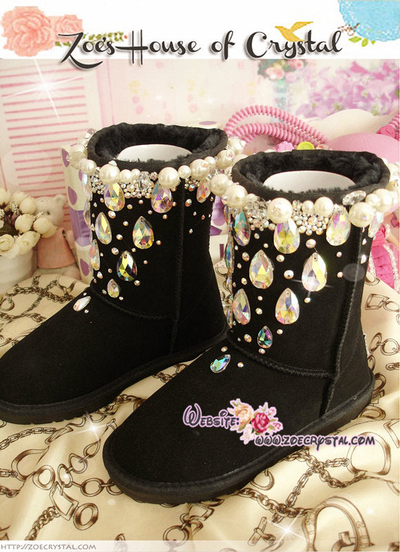 PROMOTION WINTER Black Sheepskin Wool Boots with shinning and stylish CRYSTALS - Falling Stars