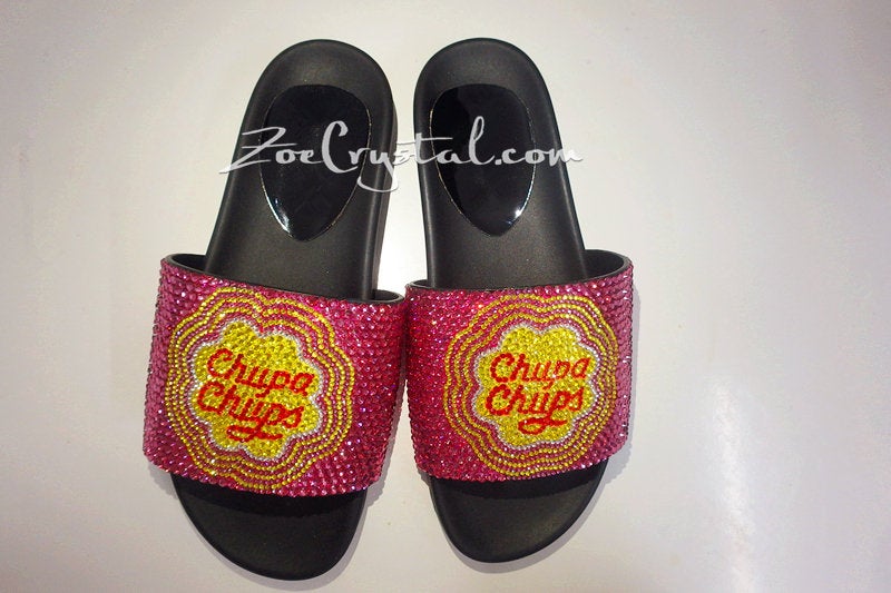 Customize Your SANDALS SLIDES Slippers - Example of Bling Bedazzled Chupa Chups with Stylish Fashionable Unique Shinny Sparkly Rhinestones