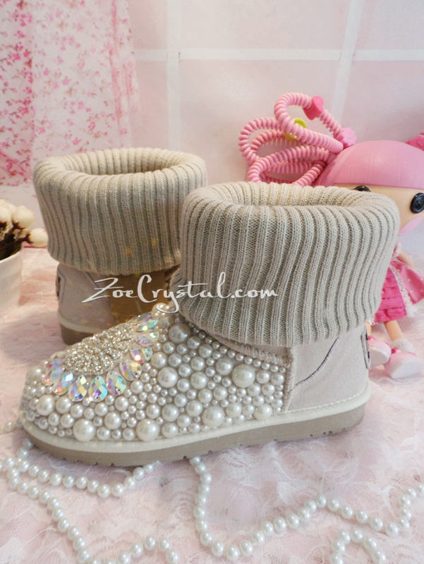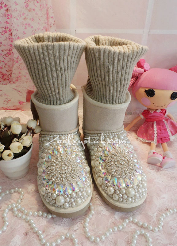 PROMOTION WINTER Beige Knit Sheepskin Fleech/Wool Boots with shinning and stylish CRYSTALS