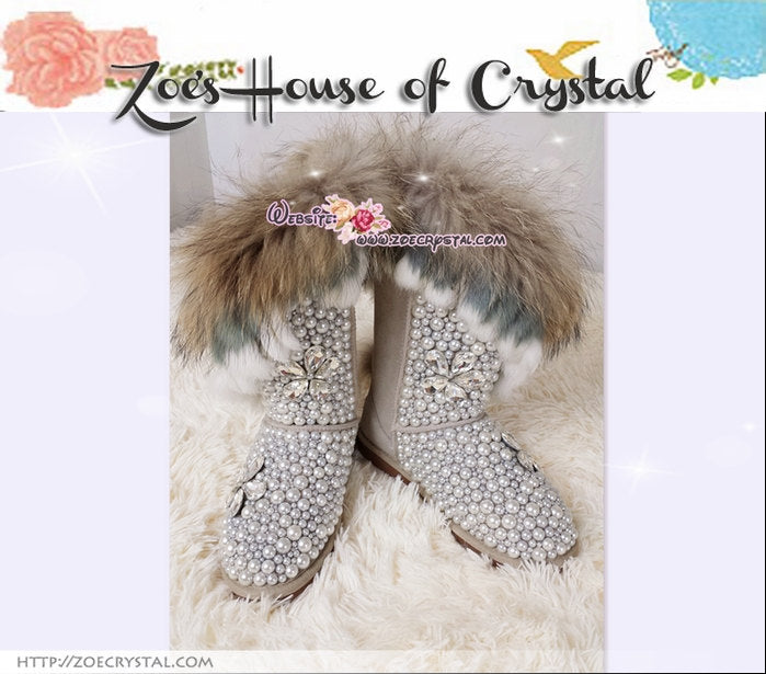 WINTER Tan Color Fur Wool Boots w shinning CRYSTALS and PEARLS