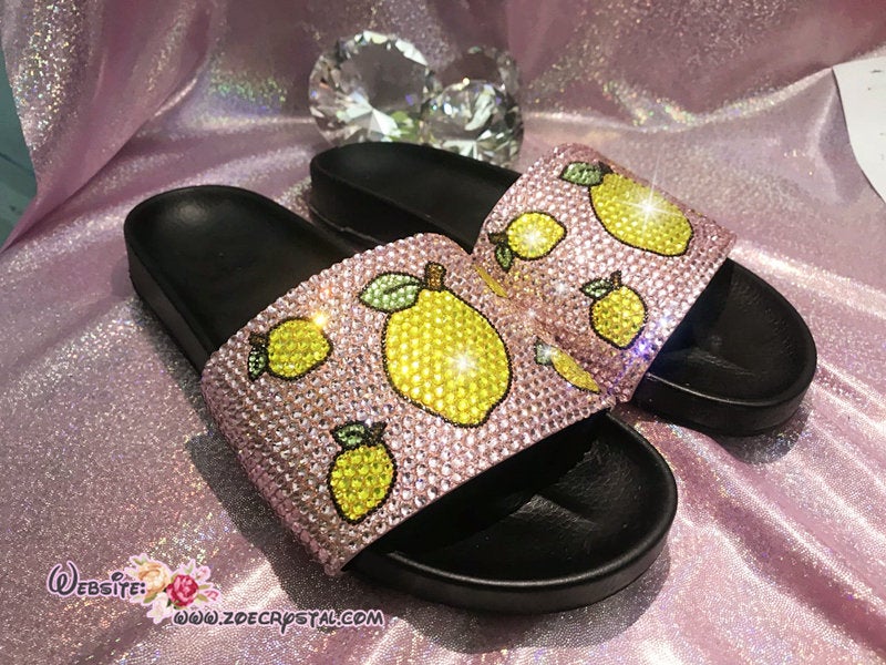 Bling Your SANDALS SLIDES Slippers for Summer Beach, Wedding, Festival with Bedazzled Swarovski Crystal Rhinestones -Lemon Fruits
