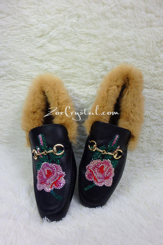 New**Bling and Sparkly Rose Print Leather with Fur Slipper made of Czech / Swarovski crystals