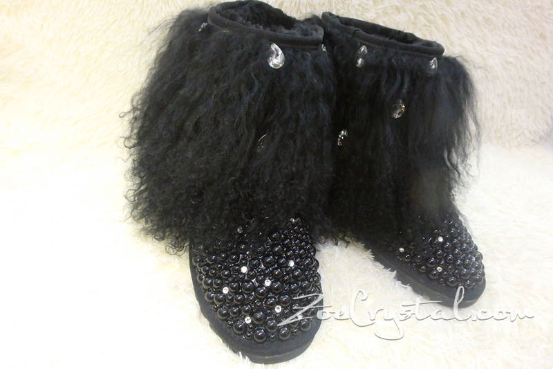 PROMOTION: WINTER Bling and Sparkly Black Curly Fur SheepSkin Wool Boots w Pearls and Big STONES