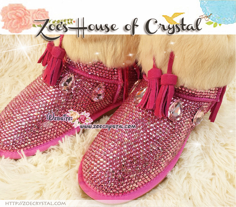PROMOTION WINTER Bling and Sparkly Pink Cuff SheepSkin Stras Wool BOOTS w shinning Czech or Swarovski Crystals