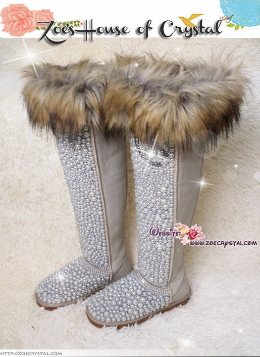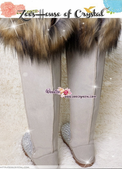 PROMOTION WINTER Knee Hight Bling and Sparkly Sand / Tan Fur SheepSkin Wool BOOTS w elegant Pearls and Cs