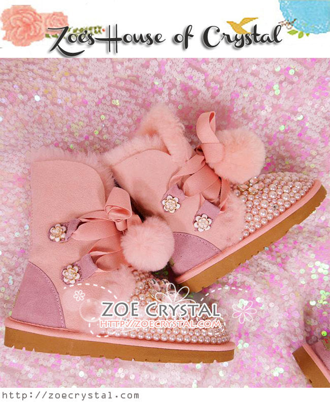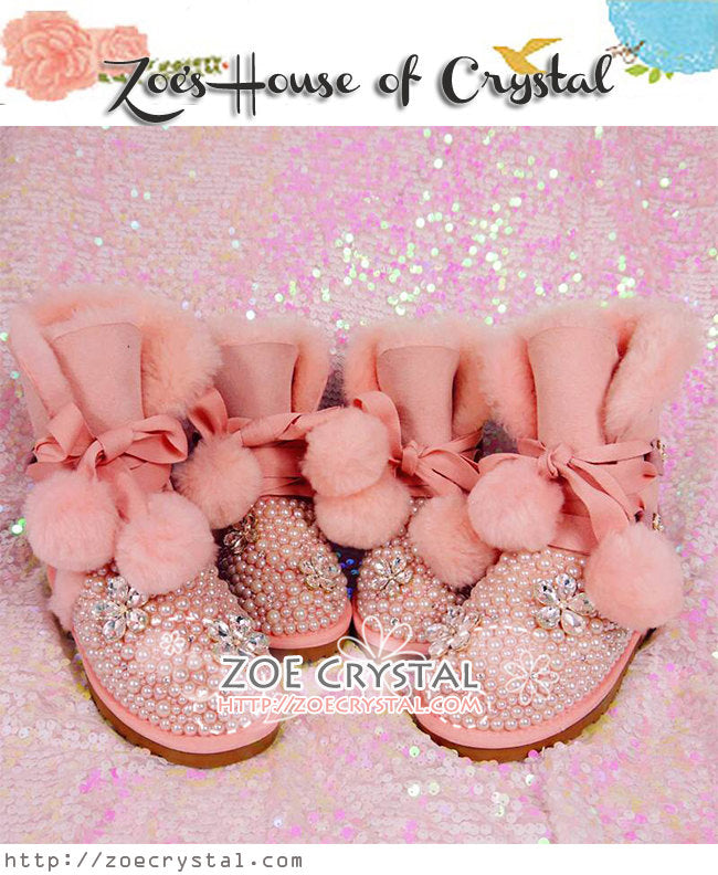 Winter Sales- Bling and Sparkly Fur Balls Pink Winter Wool BOOTS with Creamy white Pearls in Elegant Style-